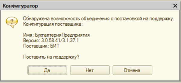 Провести сравнение и объединение Вашей конфигурации с конфигурацией решения «БИТ.ФИНАНС». Для этого воспользуемся командой главного меню «Конфигурация»-«Сравнить, объединить с конфигурацией из файла…». В окне выбора файла конфигурации указываем файл 1Cv8.cf, который находится в каталоге шаблонов (по умолчанию - подкаталог «tmplts\» каталога перемещаемых служебных файлов профиля пользователя), в подкаталоге \BIT\Finans\НомерРелизаРешенияФинанс, в нашем случае \BIT\Finans\3_0_58_41_3_1_37_1. При анализе файла поставки программа предложит встать на поддержку. Согласитесь, с этим предложением.