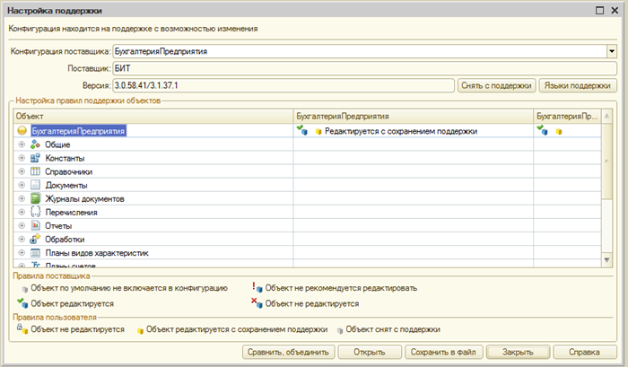 В результате сравнения Вы получите окно, демонстрирующее отличия основной конфигурации и конфигурации «БИТ.ФИНАНС». На основании анализа, проведенного в пунктах 2,3 и 4, настраиваем правила объединения для объектов конфигурации. - Для объектов, которые изменены только в Вашей конфигурации, следует снять флаги. - Для объектов, которые изменены и в Вашей конфигурации и в решении «БИТ.ФИНАНС» следует индивидуально настроить правила объединения. Возможно, если изменения в Вашей конфигурации очень существенны, объединение для данных объектов не следует производить, а следует внести необходимые изменения после объединения вручную. - Для остальных объектов следует произвести объединение с приоритетом файла. Важно: после завершения обновления обязательно запустите программу в режиме «Предприятие» с параметром «ЗапуститьОбновлениеИнформационнойБазы». Если у вас сильно устаревший релиз и вам необходимо довести его до рекомендуемого релиза, желательно, после обновления конфигурации запустить БД в пользовательском режиме для обработки накопленных данных.