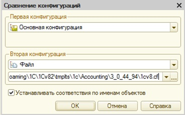 Выявить, какие объекты конфигурации «1С: Бухгалтерия предприятия, редакция 3.0» используемой Вами, были изменены по сравнению с типовой конфигурацией «1С: Бухгалтерия предприятия, редакция 3.0». Для этого следует воспользоваться сервисом сравнения конфигураций. Выбираем пункт главного меню «Конфигурация»-«Сравнить конфигурации…». В окне «Сравнение конфигураций» в поле «Первая конфигурация» выбираем значение «Основная конфигурация», а в поле «Вторая конфигурация» выбираем «Файл» и указываем путь к файлу типовой конфигурации «1С: Бухгалтерия предприятия, редакция 3.0» актуального релиза.