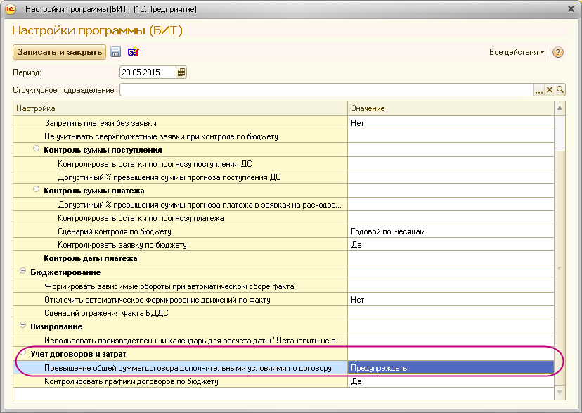 Для целей контроля сумм и сроков по договорам с контрагентами в регистр сведений «Настройки программы (БИТ)» включена следующая настройка: