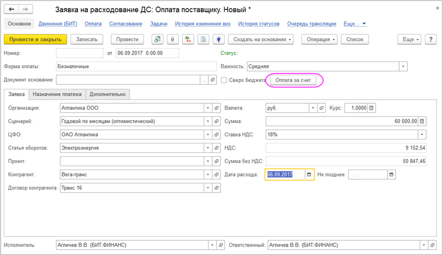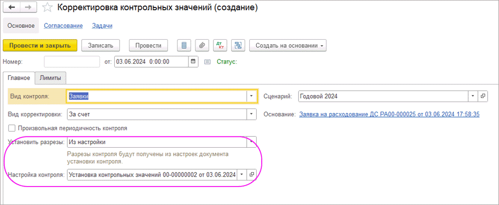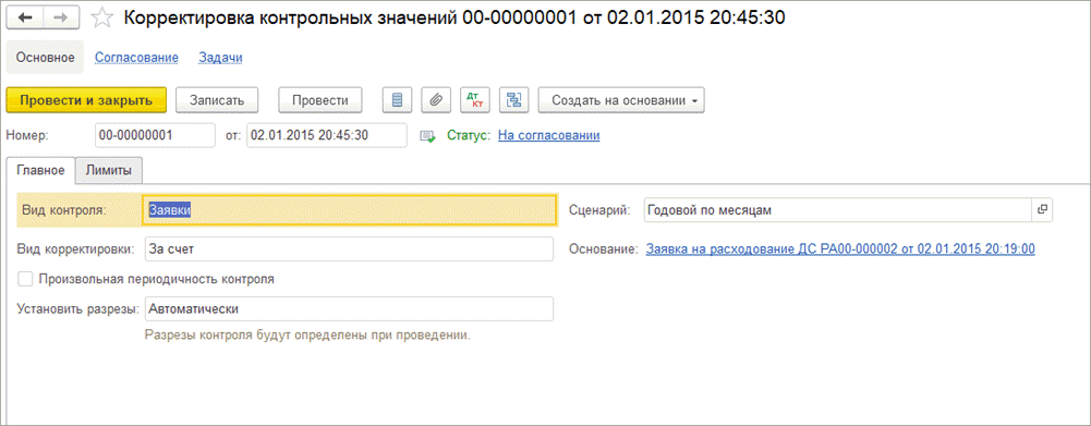В документе при создании его из “Заявки на расходование ДС” реализовано автоматическое заполнение аналитик в соответствии с разрезами контроля документа “Установка контрольных значений”, которым были установлены лимиты по статье оборотов.