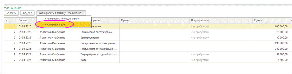 3) Далее в командной панели табличной части "Уменьшение" нажать Скопировать в таблицу "Увеличение" - Скопировать все: