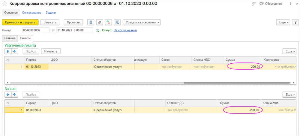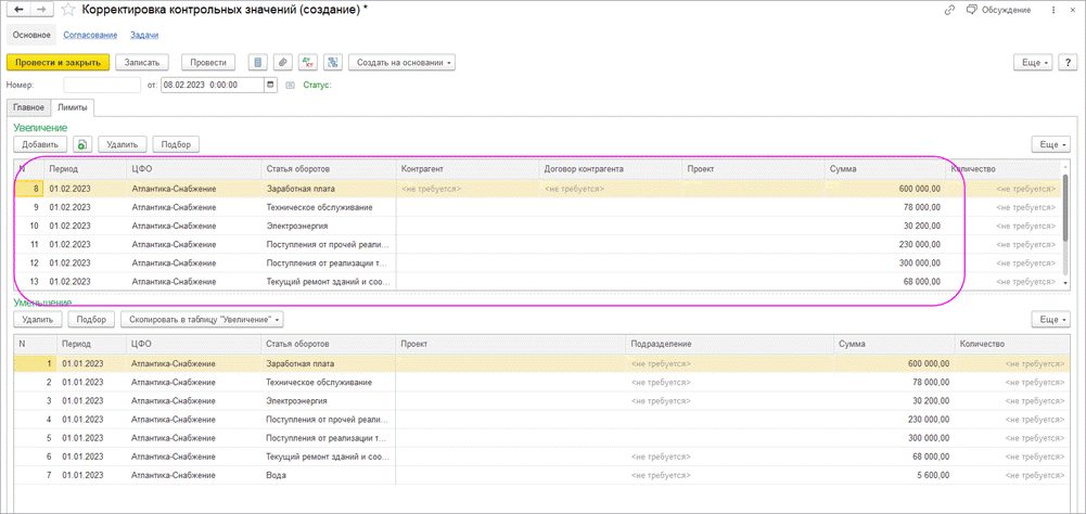 4) Данные перенесутся в табичную часть "Увеличение" на период = Февраль 2023 года. Период определяется исходя из даты документа «Корректировка контрольных значений» и периодичности контроля. После проведения документа остатки лимитов будут перенесены с Января 2023г. на Февраль 2023г.