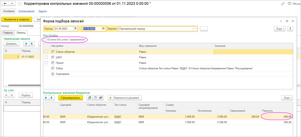 Кроме положительных остатков лимитов, в документе «Корректировка контрольных значений» с видом корректировки «Изменение» реализована возможность подобрать отрицательные остатки лимитов в табличной части «Уменьшение», и перенести их на другой период или другие аналитики, тем самым уменьшив лимиты. Для вывода отрицательных остатков в форме подбора лимитов нужно снять флаг «Остатки без учета «сверхлимита». По-умолчанию данный флаг установлен.