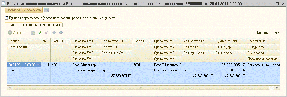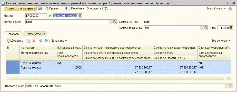 На закладке «Дополнительно», помимо комментария, важным при определенных обстоятельствах является флаг «Корректировать краткосрочную задолженность»: Если флаг установлен, то в случае отрицательного значения в графе «Сумма реклассификации», то есть, когда часть задолженности должна быть переклассифицирована из состава краткосрочной в долгосрочную, проводка по такой реклассификации записывается, иначе – нет. По умолчанию, при проведении документа делаются записи на сумму реклассификации: Дт Счет обязательства долгосрочный Кт Счет обязательства краткосрочный (Сумма по строке) -Реклассификация задолженности (В случае реклассификации краткосрочной задолженности в долгосрочную – проводка обратная). Пример проводок по реклассификации из долгосрочной задолженности в краткосрочную: