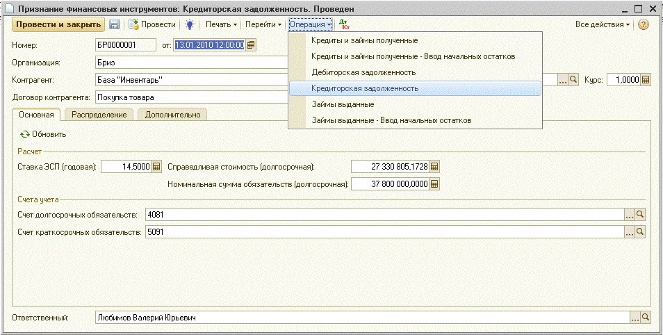 2.Формируются проводки: А) Выделение на отдельный счет долгосрочной части задолженности (поскольку предполагается, что в ходе трансляции до проведения данного документа вся дебиторская задолженность отражалась как краткосрочная): Дт Счет учета краткосрочных обязательствКт Счет учета долгосрочных обязательств Б) Кроме того, отражается резерв в виде разницы между номинальной и справедливой стоимостью задолженности на дату документа: Дт Счет учета долгосрочных обязательств Кт Счет резерва Сумма = Разница между номинальной и справедливой стоимостью Аналитика – Контрагент, Договор Валюта, валютная сумма– в валюте задолженности.