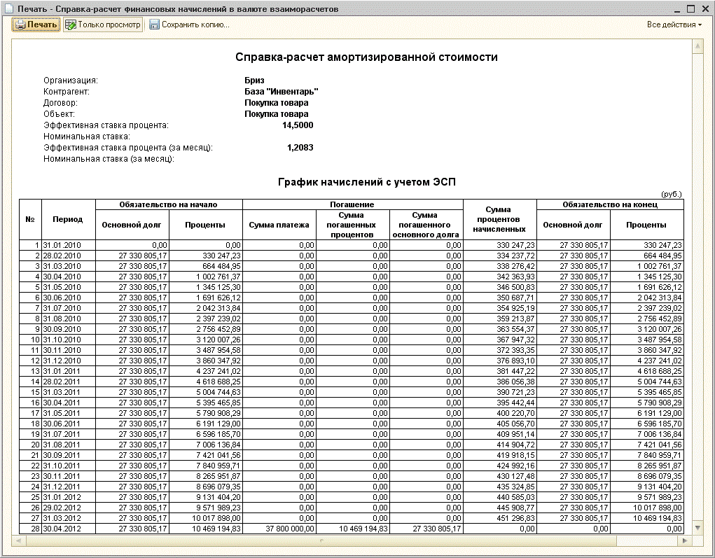 Замечание. Если реквизит «Номинальная сумма обязательств» не заполняется автоматически, нужно проверить, действительно ли на счете краткосрочных обязательств числится задолженность (например, через отчет «Оборотно-сальдовая ведомость по счету (управленческий)», который находится в разделе «Управленческий учет (БИТ)»). Если не числится, возможно, либо неправильно указан счет учета обязательств в документе, либо задолженность не транслировалась в МСФО. При проведении документа формируются: 1.Графики финансовых начислений (справки-расчеты) – в валюте взаиморасчетов и в валюте регламентированного учета (рублях). Они отражаются в системе как записи в регистр накопления «Финансовые начисления (МСФО)»; Справки доступны по кнопке «Печать», и далее – соответствующий пункт выпадающего списка. Сам график выглядит следующим образом: