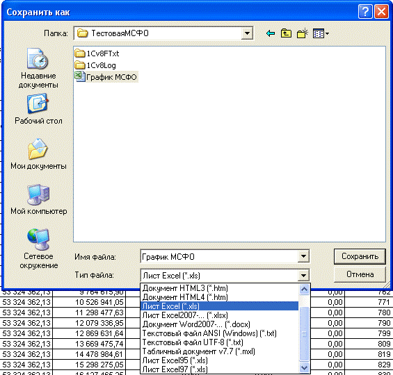 Фактически он представляет из себя «раскрытие дисконта» - начисление сложных процентов по рыночной ставке на ежемесячной основе. Погашение отражается в соответствии с реальным графиком платежей, заданным в документе «Дополнительные условия по договору». По кнопке «Сохранить копию» можно экспортировать его, в частности, в Excel: для этого в появившемся окне диалога нужно задать имя, выбрать формат таблицы Excel и местонахождение файла: