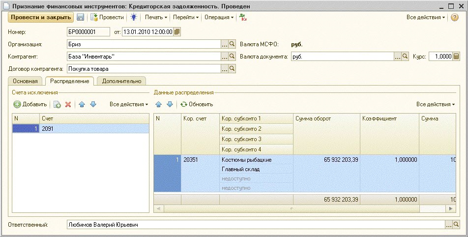 Замечание: в качестве счета резерва выступают счета учета приобретенных ценностей (различные субсчета и аналитики), если речь идет о задолженности по расчетам с поставщиками и подрядчиками (что определяется по виду договора – «с поставщиком» или «с комитентом»). При этом аналитика счетов и субсчетов приобретенных ценностей в проводке распределяются пропорционально доле оборота каждого субсчета/аналитики в общем обороте по приобретению, приведшему к возникновению данной кредиторской задолженности. Подробности такого распределения можно видеть на отдельной закладке «Распределение». На этой закладке при необходимости можно внести счета-исключения (например, счет «НДС по приобретенным ценностям») – тогда обороты по этим счетам не будут участвовать в корректировке.