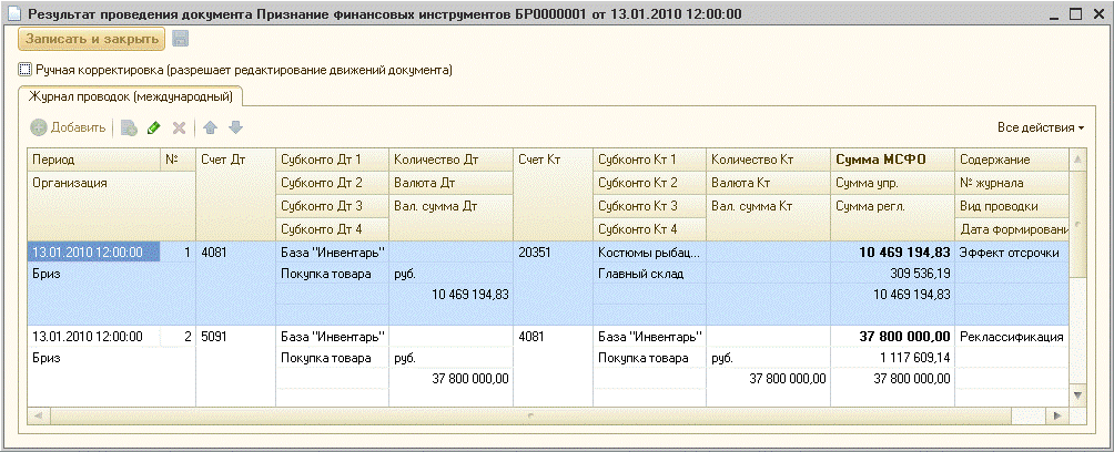 3.Формируются записи в регистр сведений «Параметры финансовых инструментов (МСФО)» (счета учета); 4.Формуется запись в регистр сведений «События финансовых инструментов (МСФО)» - регистрируется событие «Признание».
