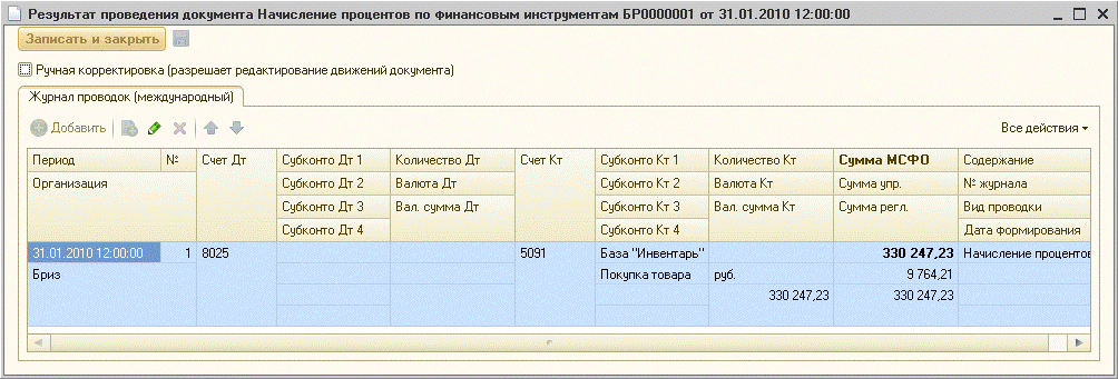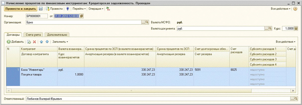 На закладке «Дополнительно» можно указать какой-либо комментарий к документу (текст, который не влияет на проводки). При проведении документа в учете по МСФО формируются записи: Дт Счет расходов Кт Счет учета долгосрочной дебиторской задолженности Сумма процентов Если речь идет о задолженности по расчетам с поставщиками и подрядчиками (что определяется по типу договора – «с поставщиком» или «с комитентом»), то больше никаких проводок не делается. Если же речь идет об иных счетах расчетов, делается еще проводка на амортизацию резерва: Дт Счет расходовКт Счет резерва Пример проводки: