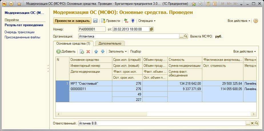 В результате проведения документа формируются движения по увеличению стоимости основного средства, то есть капитализации расходов понесенных в процессе модернизации в стоимость актива.