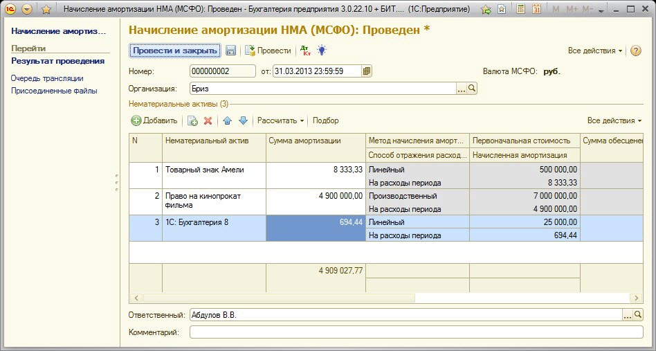 Результатом проведения документа «Начисление амортизации НМА (МСФО)» являются проводки по начислению амортизационных расходов по нематериальным активам, обозначенных в табличной части. Суммы пользователь может предварительно проверить и откорректировать в табличной части.