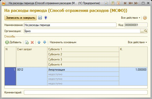 Амортизационные начисления за каждый период должны признаваться в прибыли или убытке, если только они не включаются в балансовую стоимость другого актива. Принцип признания амортизационных расходов определяется для каждого объекта основного средства. Для этого существует справочник «Способы отражения расходов по амортизации (МСФО)».