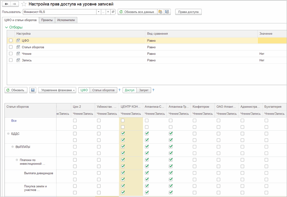 В шапке указывается Пользователь или Группа пользователей, для которых настраиваются права доступа к данным. На закладках «ЦФО и статьи оборотов», «Проекты» и «Исполнители» описываются права доступа к данным отдельно по каждому разделителю. В поле «Отбор» указываются условия отбора для значений областей доступа. В табличной части «Настройки прав доступа» с помощью установки флажков настраиваются права на чтение и запись (редактирование) данных. По кнопке «Обновить» табличная часть заполняется списком действующих значений областей доступа. Вид настройки может принимать значения «Доступ» или «Запрет» к чтению или редактированию данных.