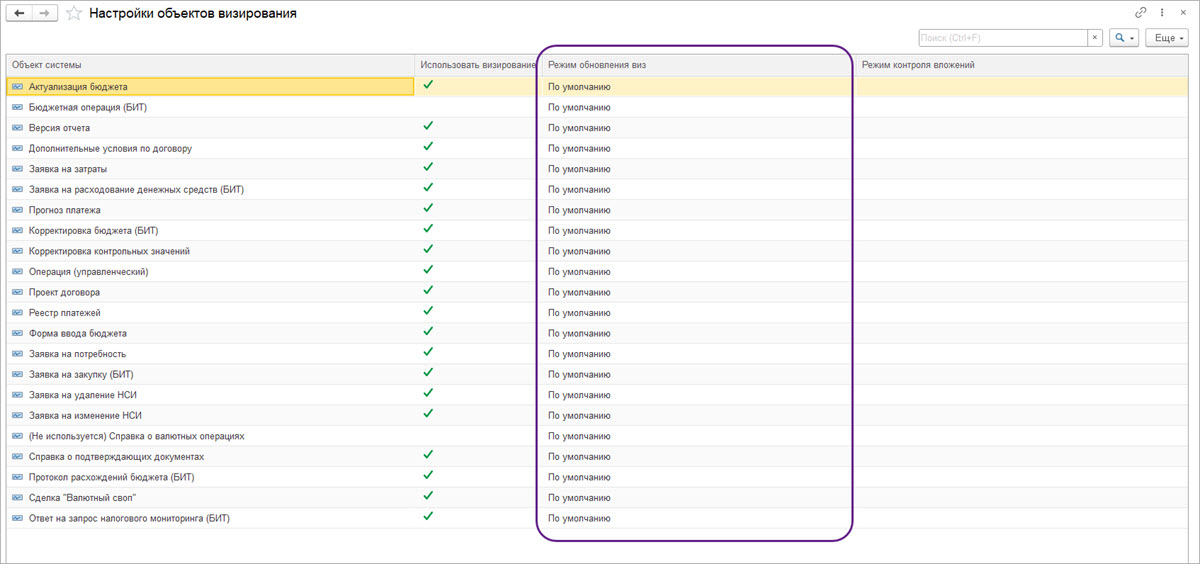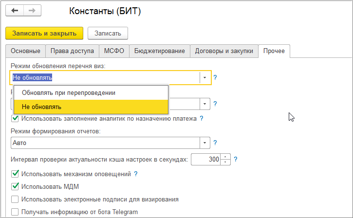 В форме «Константы (БИТ)» на закладке «Прочее» выбирается режим обновления перечня виз в документах: «Обновлять при перепроведении» или «Не обновлять».