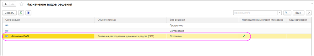 Настройку можно устанавливать для определенных типов документов и для определенных Организаций, например, только для Заявок на расходование денежных средств и только для организации «Атлантика».