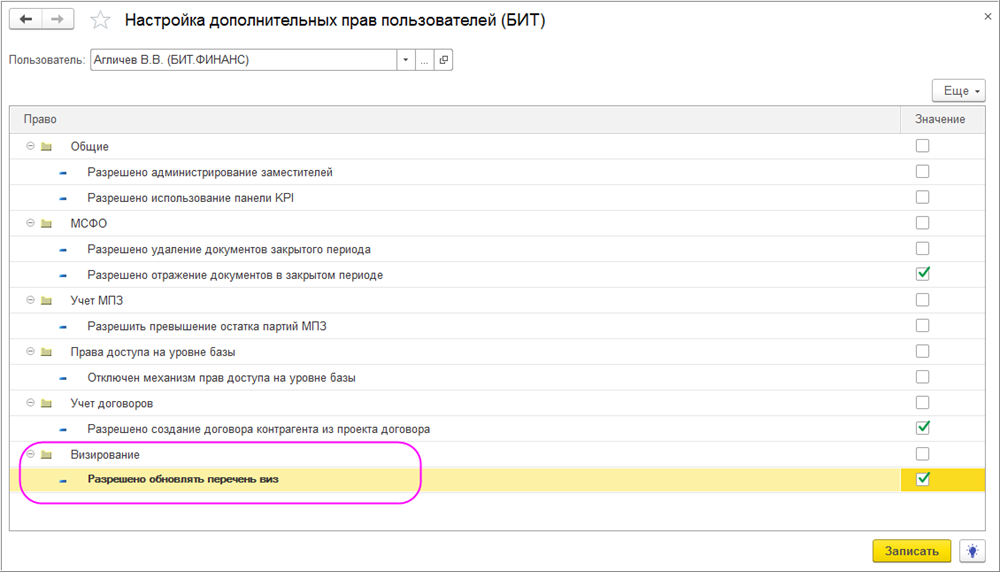 Примечание. Для того, чтобы пользователь или группа пользователей могли в документах системы принудительно обновлять перечень виз по кнопке «Обновить» (например, в случае изменения маршрута визирования), нужно в Настройке дополнительных прав пользователей (БИТ) (раздел «Настройки (БИТ)» - подраздел «Права доступа» - команда «Настройка дополнительных прав пользователей (БИТ)») установить значение «Да» напротив настройки «Разрешено обновлять перечень виз».