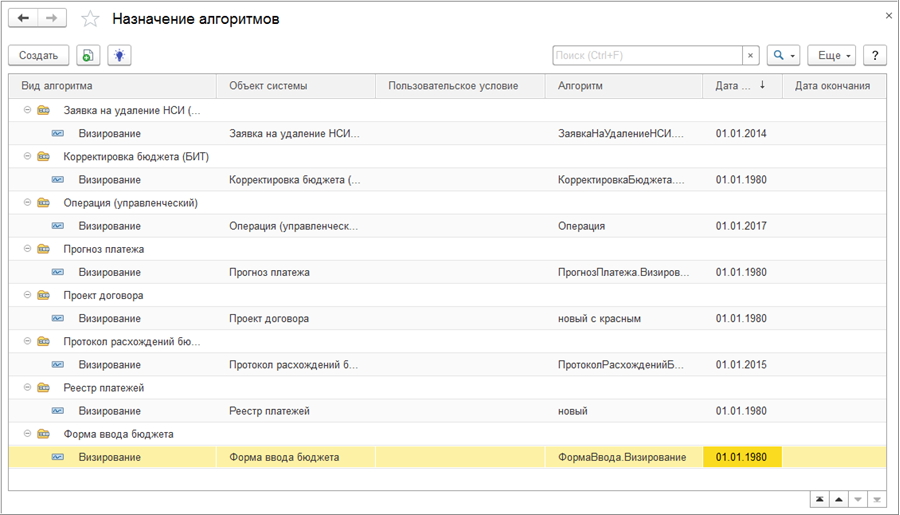Для назначения алгоритмов процессов объектам системы используется регистр сведений «Назначение алгоритмов» (раздел «Управление процессами» - команда «Назначение алгоритмов»).