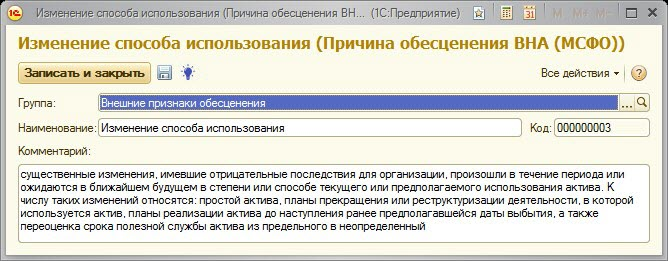 Причина обесценения – элемент справочника «Причина обесценения ВНА (МСФО)»;
