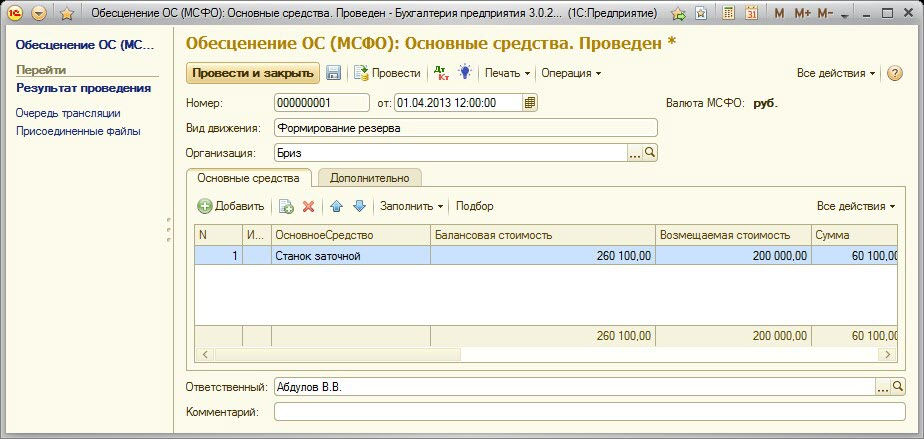 Счет снижения стоимости – счет отражения снижения стоимости основного средства. Заполняется автоматически на основе регистра сведений «Параметры классов ВНА (МСФО)»;