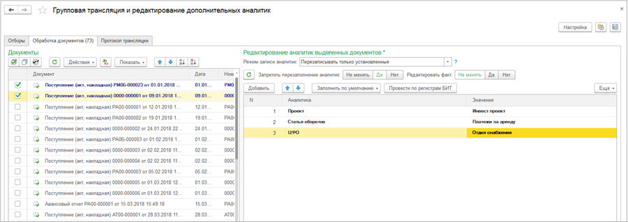 Записать аналитики – в выбранных документах будут записаны дополнительные аналитки;
