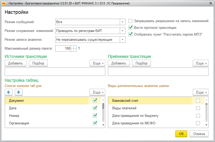 Для целей трансляции документов в форме «Настройки» указываются источник и приемник данных. Если поля остаются не заполненными, то трансляция проводится по всем существующим правилам заполнения полей при трансляции с учетом настроенных приоритетов.