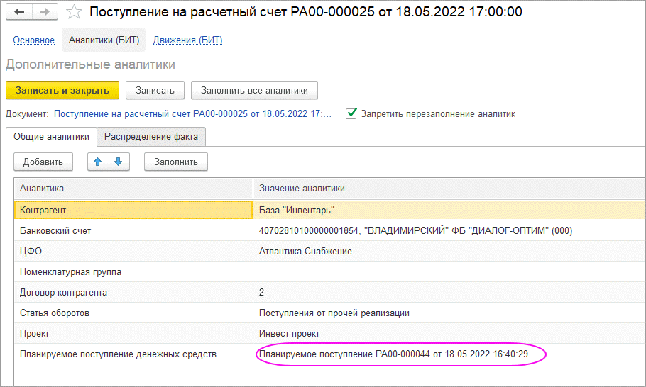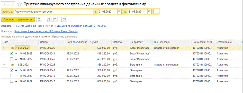 Обработка предназначена для автоматической привязки документов «Планируемое поступление ДС» к документам «Поступление на расчетный счет» и «Поступление наличных». К одному документу фактического поступления ДС с помощью обработки можно привязать только один документ «Планируемое поступление».