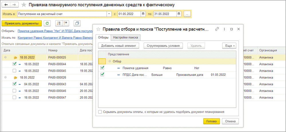 Две важные настройки обработки: «Отбирать» и «Искать по». По гиперссылке в настройке «Отбирать» открывается форма, в которой можно настроить критерии отбора документов «Поступление на расчетный счет», а также документов «Планируемое поступление ДС». В примере настроен отбор по Дате поступления документов «Планируемое поступление ДС»: отобраны документы с датой поступления больше 01.05.2022. Отбор документов, не помеченных на удаление, установлен по умолчанию в обработке.