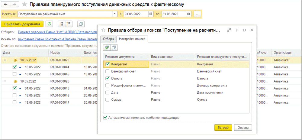 После выполнения этих двух настроек нужно нажать кнопку «Готово». Флажками в обработке будут выделены наиболее подходящие документы «Планируемое поступление ДС». Нужно проверить на сколько корректно подобраны документы и нажать кнопку «Привязать документы». В документах «Поступление на расчетный счет» появится ссылка на документ «Планируемое поступление ДС», а также будут заполнены все аналитики из документа планирования.
