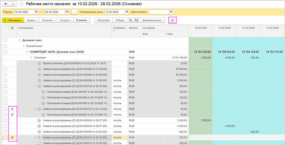 Обработка «Рабочее место казначея» (раздел «Казначейство» - «Рабочее место казначея») предназначена для осуществления оперативного планирования платежей.