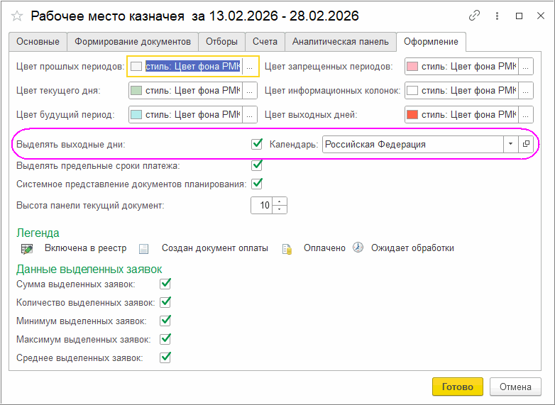 На закладке «Оформление» можно раскрасить обработку в разные цвета. Также здесь показаны настройки, по которым будет происходить отображение выделенных документов «Заявка на расходование денежных средств» в форме обработки.