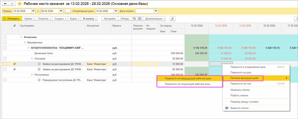 Реализована возможность переноса платежей выходных дней на следующий или предыдущий рабочий день. Для этого в список команд для выделенных заявок (выделение с Shift) добавлено подменю «Платежи выходных дней», в котором можно выбрать «Перенести на следующий рабочий день» или «Перенести на предыдущий рабочий день».