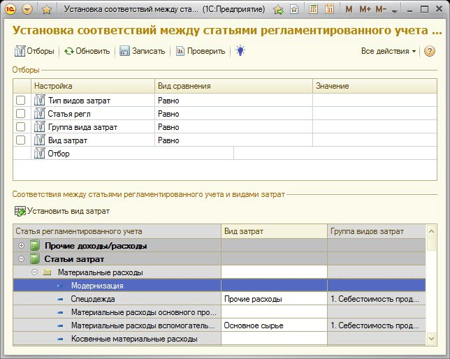 Обработка «Установка соответствий для видов затрат (МСФО)» предназначена для отображения и установки соответствия между элементами справочника «Виды затрат (МСФО)» с одной стороны и справочников «Статьи затрат» и «Прочие доходы и расходы» с другой стороны.
