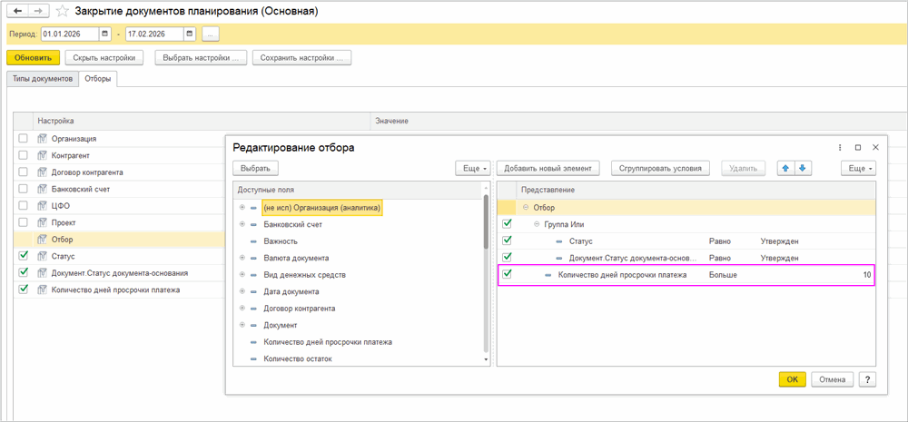 Также добавлен отбор «Количество дней просрочки платежа». Этот отбор позволяет подобрать в обработку и закрыть документы «Платежная позиция», у которых количество дней просрочки, к примеру, больше 10.