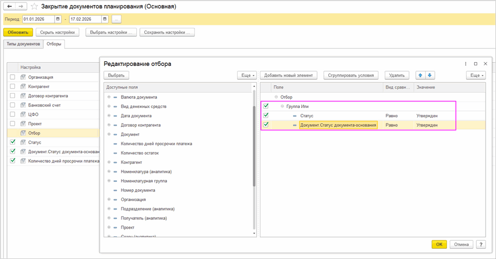 В версии 3.1.66 в обработку добавлен отбор по статусу документа-основания - Документ.Статус документа-основания. Этот отбор позволяет подобрать в обработку и закрыть документы «Платежная позиция», к примеру, только по утвержденным заявкам на расходование ДС. Для того, чтобы в обработку попали и Заявки в статусе «Утвержден» и Платежные позиции по утвержденным заявкам, рекомендуется выполнить отбор, как показано ниже на скриншоте: