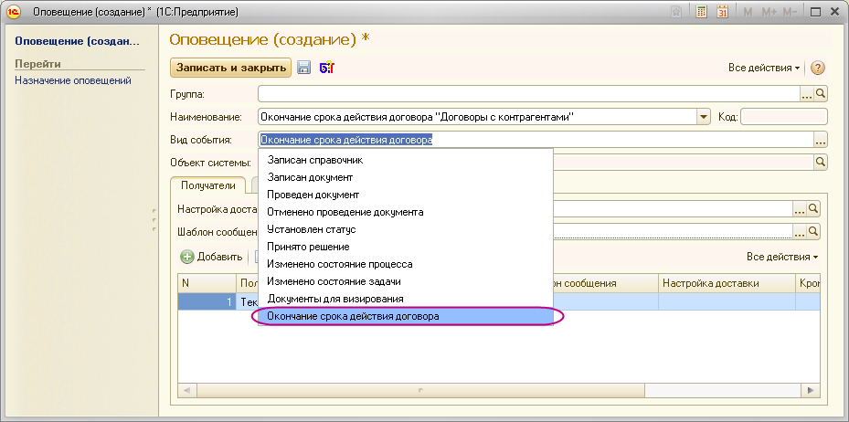 Примечание. События для оповещений регистрируются только с помощью регламентного задания «Зарегистрировать напоминания по договорам».