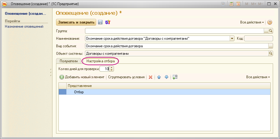 Для этих видов событий используется закладка «Настройка отбора», на которой возможно добавить критерии отбора, по которым будут отобраны. Также на этой закладке важным является реквизит «Кол-во дней для проверки», с помощью этого реквизита определяется, за сколько дней необходимо проверять договоры.