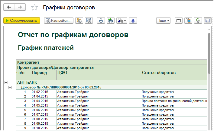 Отчет «Графики договоров» (раздел «Договоры и закупки» - «Графики договоров») показывает графики платежей и графики начислений по договорам, созданные в системе при помощи документов «Дополнительные условия по договору».