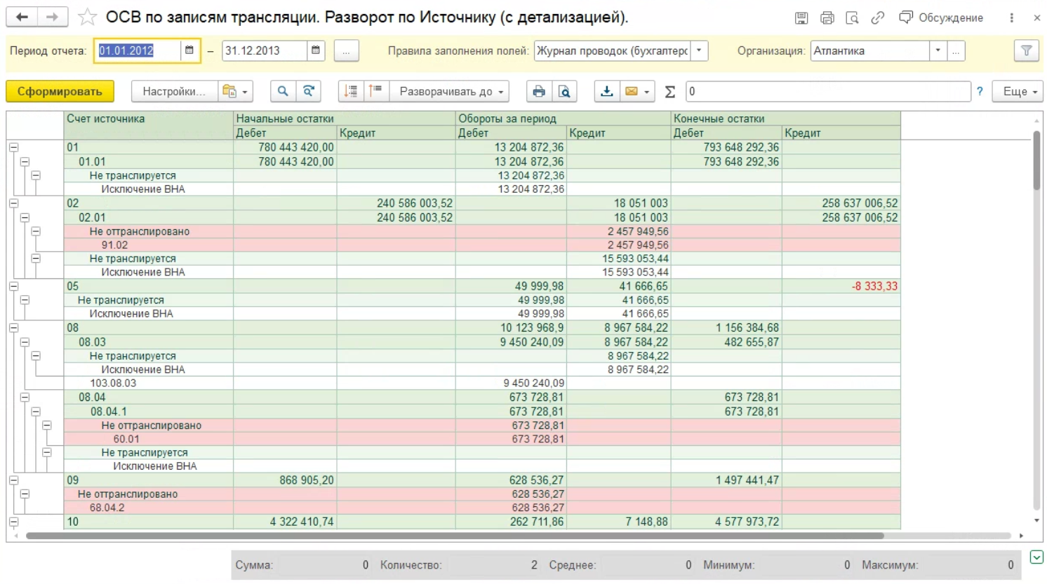 Остатки по счетам только верхнего уровня группировки. Например, в случае трансляции данных из РСБУ в МСФО для варианта отчета «Разворот по источнику» будут отображаться остатки только по счетам РСБУ.