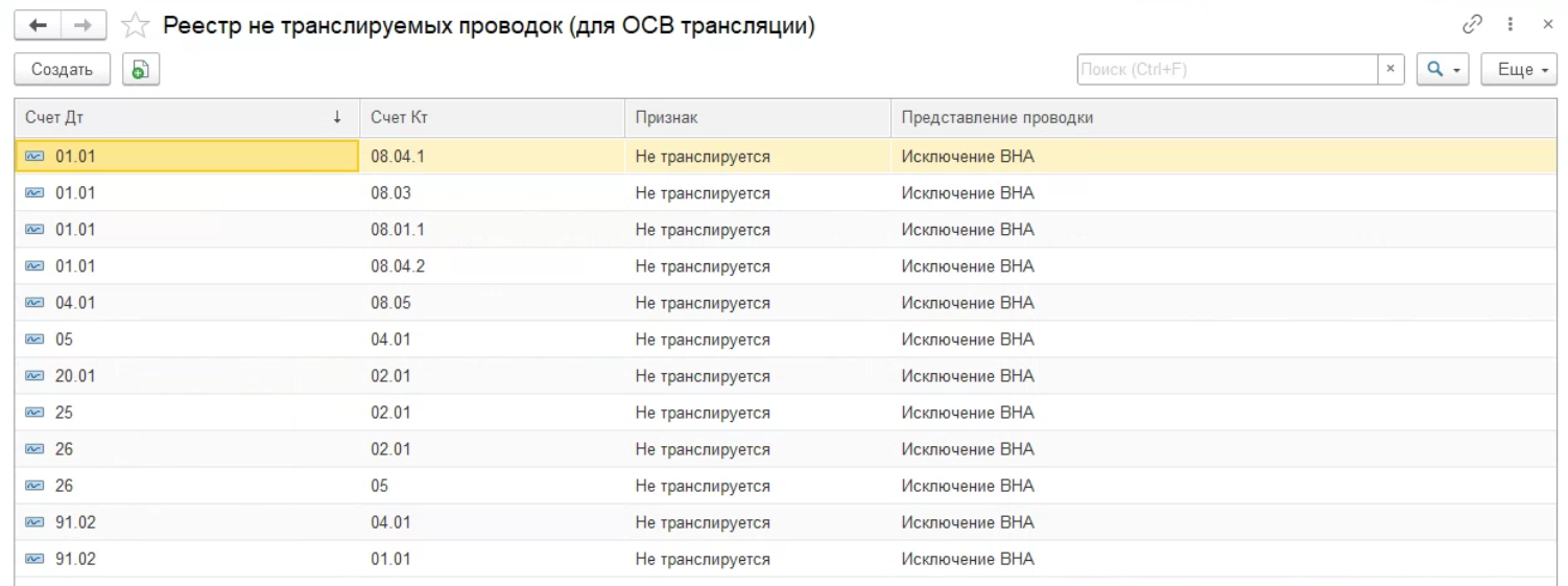 Например, если ведется параллельный учет ВНА, то для всех проводок бухгалтерского учета по ОС и НМА можно задать признак, что эти проводки не транслируются, и задать представление в отчете "Исключение ВНА".
