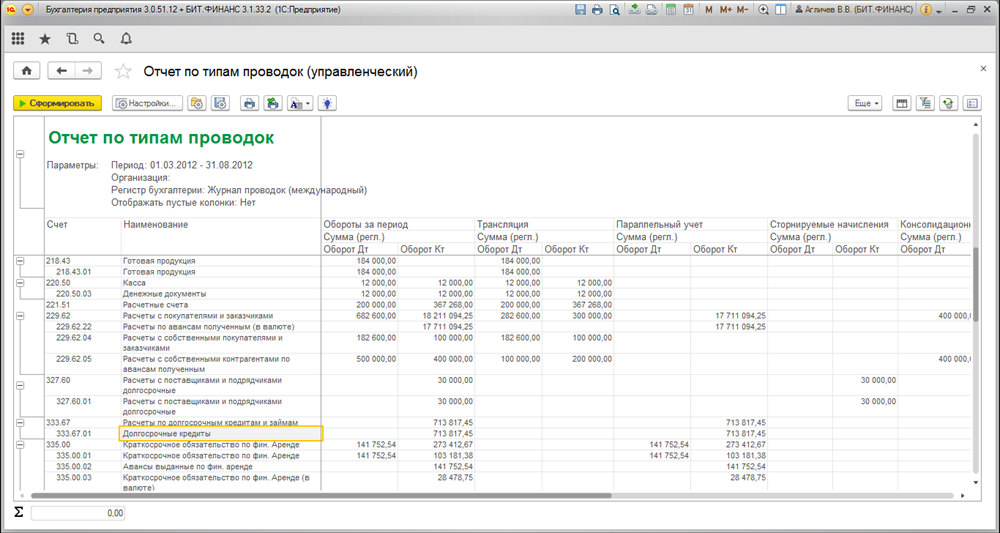 В колонках «Трансляция», «Параллельный учет», «Сторнируемые начисления» и т.д. отображаются обороты по элементам справочника «Типы проводок».