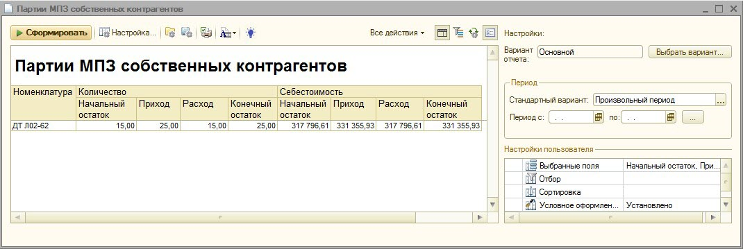 В отчете «Партии МПЗ собственных контрагентов» отображается информация о количественном и суммовом движении партий МПЗ по контрагентам, указанным в регистре сведений «Собственные контрагенты (БИТ)». В отчете отображается информация по партиям МПЗ, которые были проведены в учете только одной из сторон сделки.