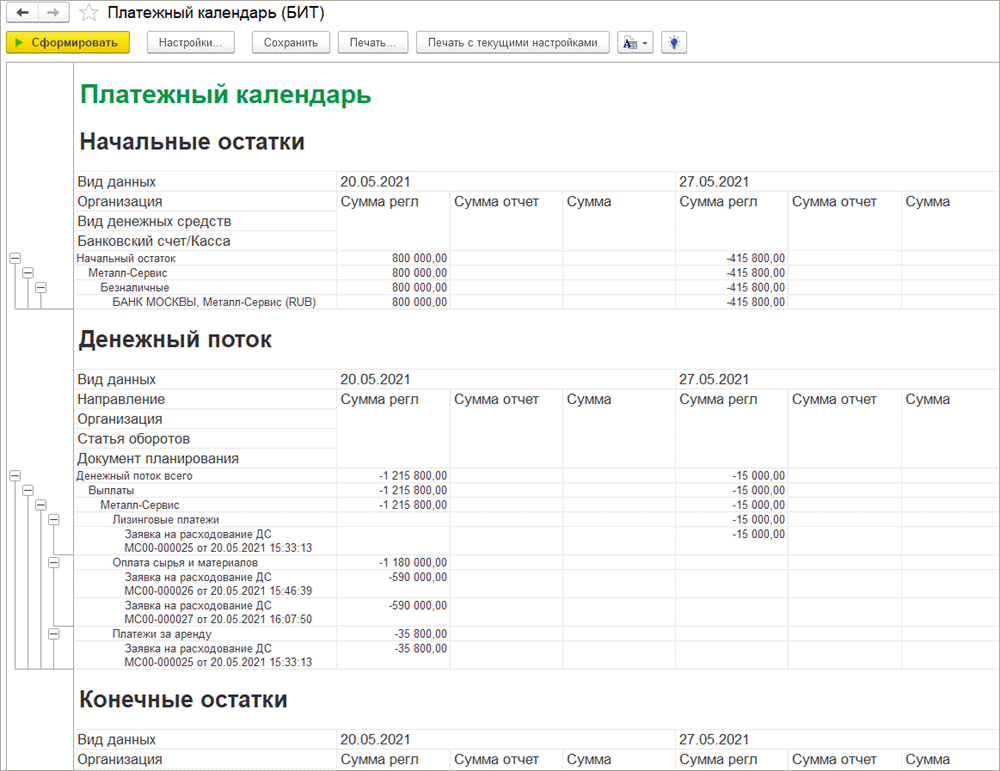 Для оперативного планирования и контроля движения денежных средств в решениях «БИТ.ФИНАНС» предназначен отчет «Платежный календарь» (раздел «Казначейство» - «Платежный календарь»). Данный отчет показывает остатки на счетах и в кассе и движения денежных средств на предстоящие периоды, он строится на основании введенных в систему заявок на расходование денежных средств и планируемых поступлений денежных средств.