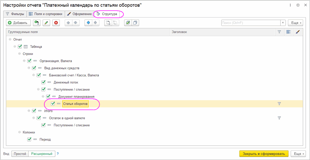 1. Настройку отбора по статьям оборотов необходимо выполнять на уровне группировки «Статья оборотов».