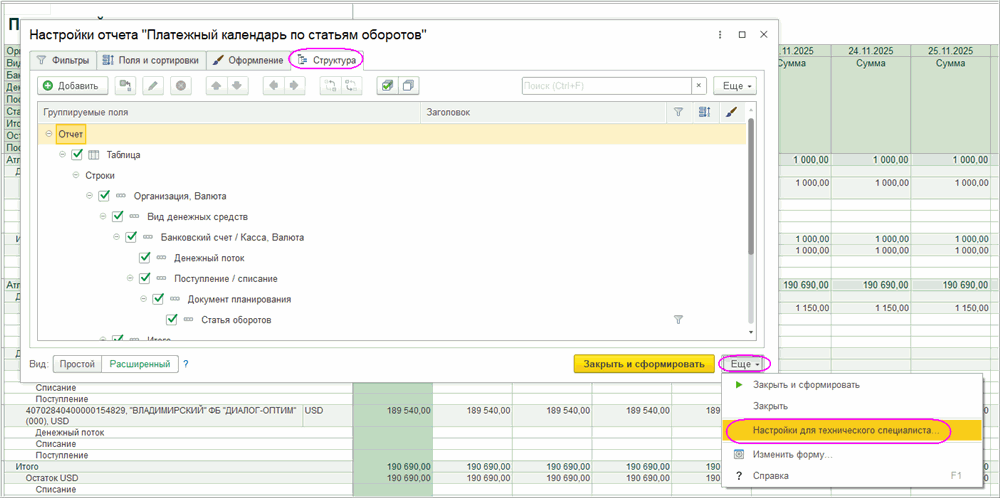3. Далее в форме настроек отчета нажимаем «Еще – Настройки для технического специалиста».