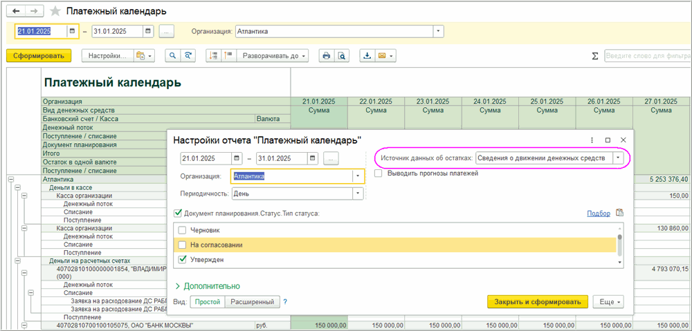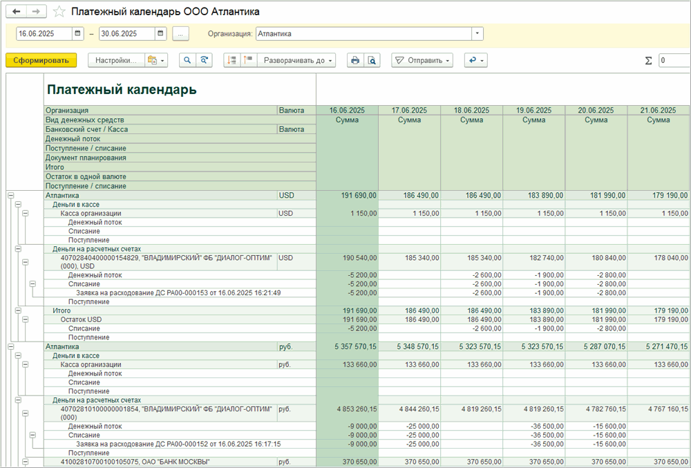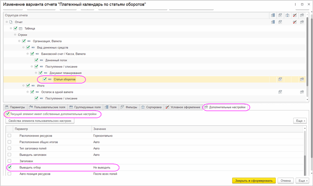 Примечание. Отбор по реквизитам документа планирования нужно выполнять на уровне группировок «Денежный поток» и «Поступление/списание».