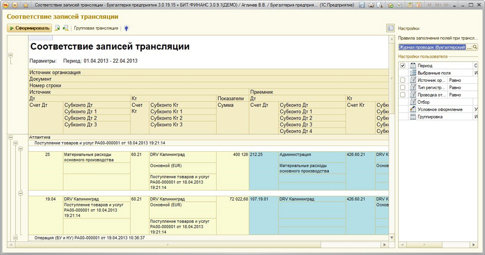 Например, для того, чтобы проанализировать список проводок РСБУ, которые не были оттранслированы в МСФО необходимо установить в отчете признак «Проводка оттранслирована» в режим «Нет».