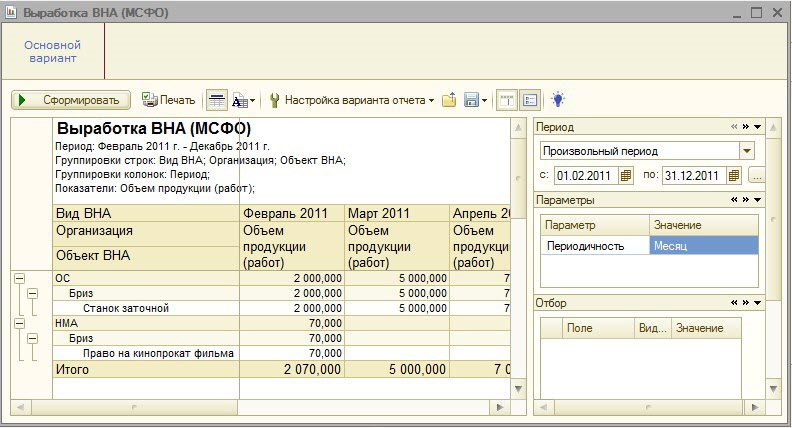 Отчет «Выработка ВНА (МСФО)» предназначен для подробного анализа выработки объектов внеоборотных активов, в разрезе организации за указанный период. Для произвольного периода можно указать следующую периодичность: день, неделя, декада, месяц, квартал, полугодие, год.