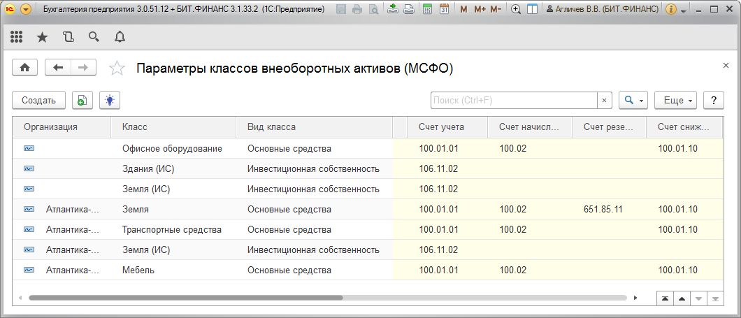 Для каждого класса определяются параметры учета, которые фиксируются в регистре сведений «Параметры классов ВНА (МСФО)» (Раздел «ВНА МСФО (БИТ)»).
